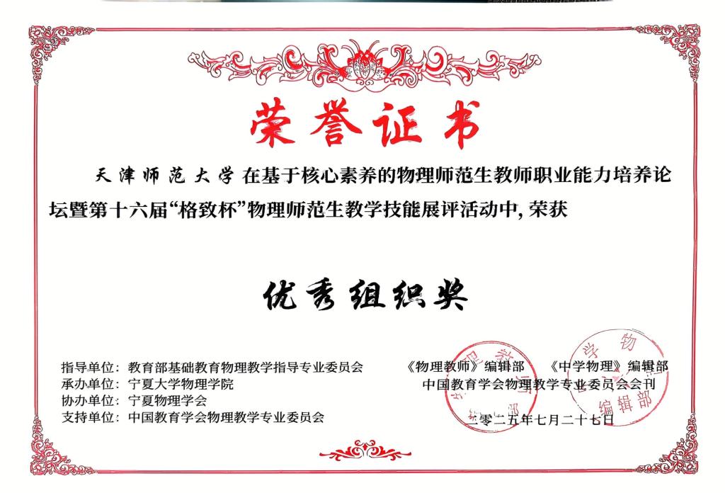 7月25日至27日,基于核心素养的物理师范生教师职业能力培养论坛暨第十六届“格致杯”全国物理师范生教学技能展示与交流活动在宁夏大学举行。本次活动吸引全国百余所高校参与,我校德赢ac米兰官方合作师生表现突出,共斩获包括“优秀组织奖”在内的11项荣誉,其中温熙雅包揽教学技能展示、创新实验设计与自制教具双项一等奖,陈楷月、侯家瑞、于佳灵、张欣4位同学在两项赛事中均获二等奖。