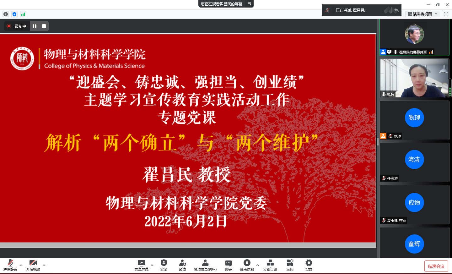 6月2日下午,德赢ac米兰官方合作党委邀请学校关工委报告团成员、政治与行政学院教授翟昌民作题为《解析“两个确立”与“两个维护”》专题党课。学院全体教职工和学生党员在线上聆听。会议由学院党委书记张梅主持。