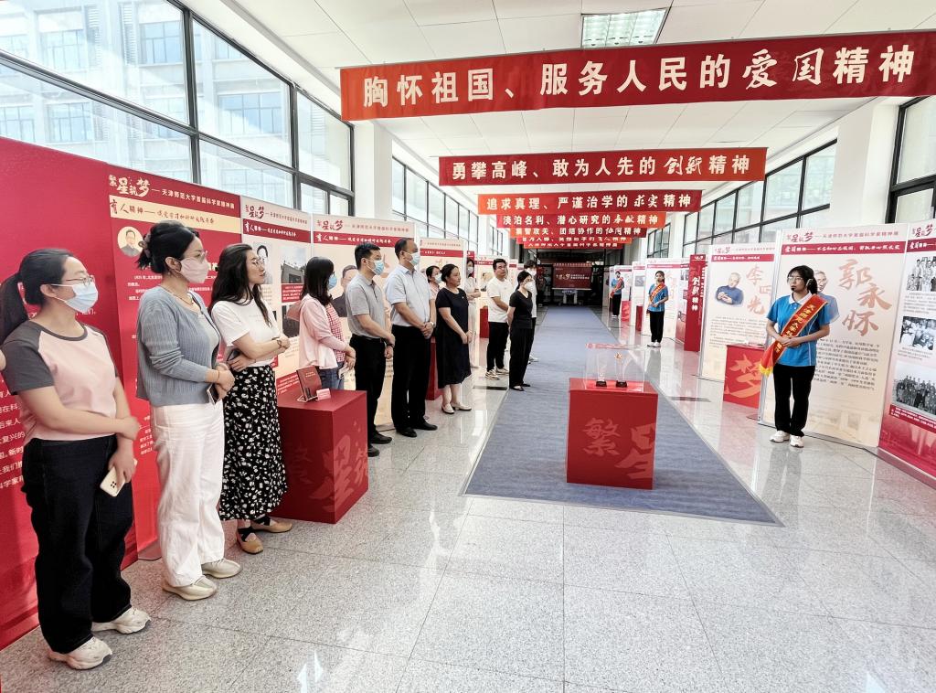 老师们跟随学生志愿者的讲解,通过59块展板和11件展品,认真学习了从李四光、侯德榜、钱学森,到袁隆平、屠呦呦、“北斗”团队等18位科学家及团队的事迹,对以“爱国、创新、求实、奉献、协同、育人”为内涵的科学家精神有了更加深刻的感悟。参观过程中,大家不时地相互交流,热烈讨论,分享各自在教学和科研工作中对科学家精神的理解和体会。