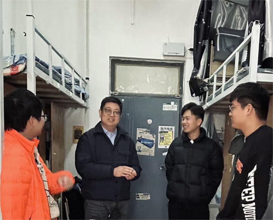 在学生公寓26号楼走访过程中,学院领导老师与2023级本科生进行了面对面、点对点沟通交谈。张伟勉励学生,作为新时代物理青年,要抓住人生中最宝贵的大学时光,励志勤学、刻苦磨炼,坚定不移听党话、跟党走,在激情奋斗中绽放青春,努力成长为担当民族复兴大任的时代新人。张伟还向同学们了解了校园生活情况,嘱咐同学们近期寒潮来袭,要及时根据天气变化增加衣物,注意防寒保暖。希望同学们要相互关照,尤其是天津籍学生要主动帮助外省市同学了解天津、融入天津,更加热爱我们求学的城市。